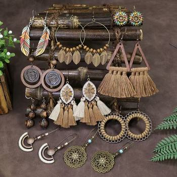 手作り合金木製ビーズダングルドロップピアスボヘミアン幾何学的タッセルイヤリングサークルフープ耳エスニックBohoジュエリー